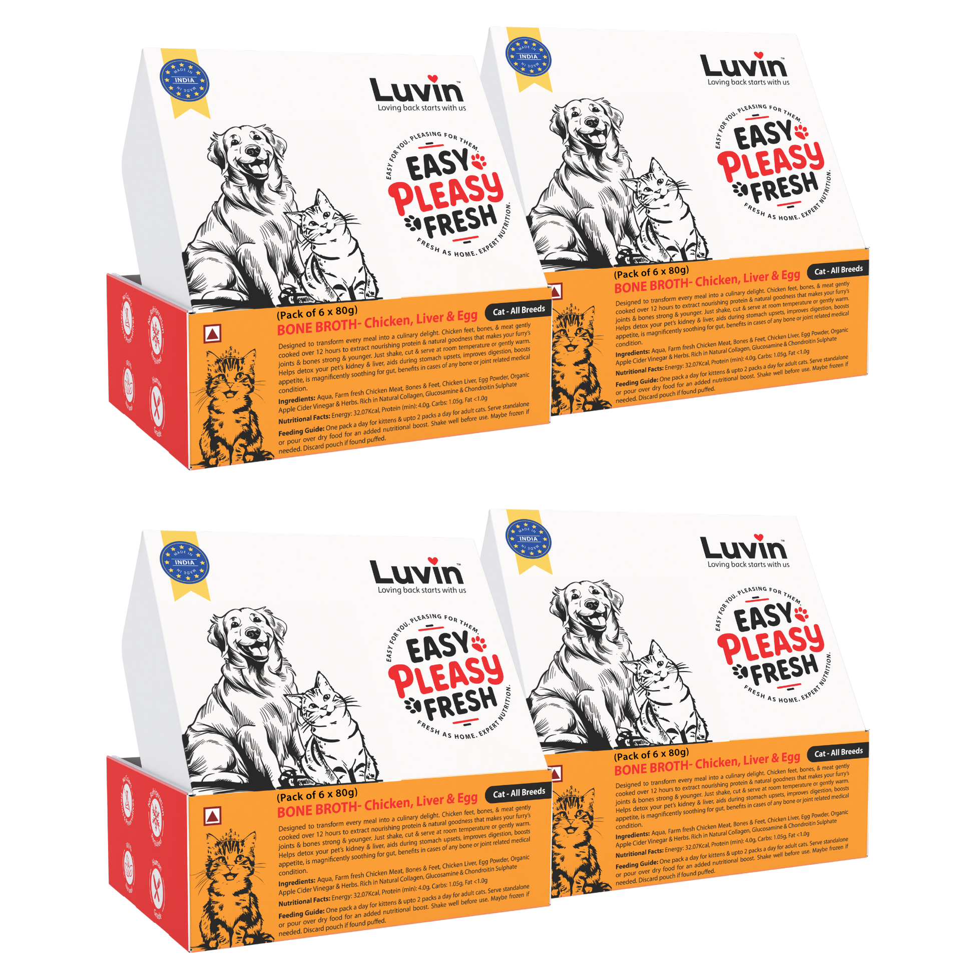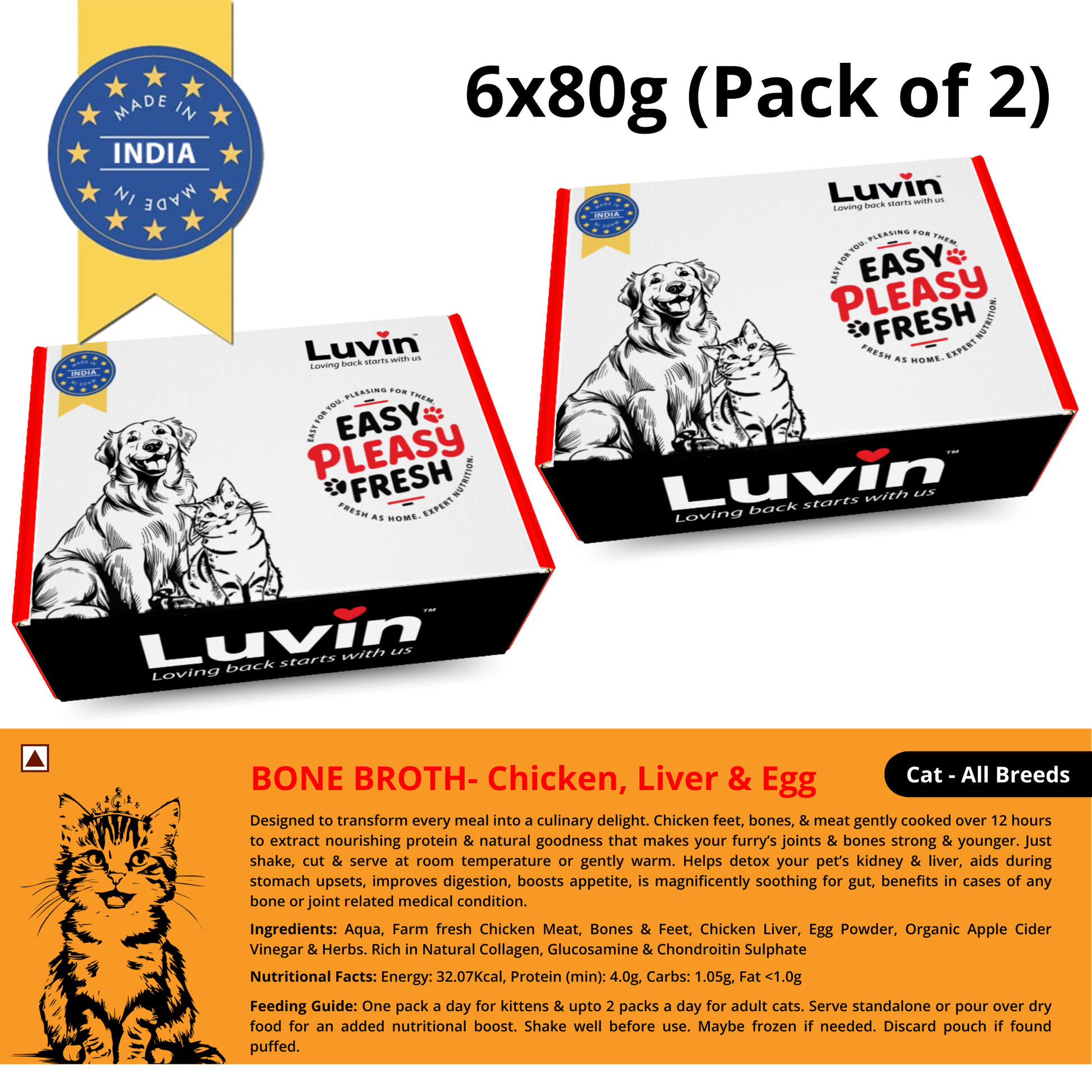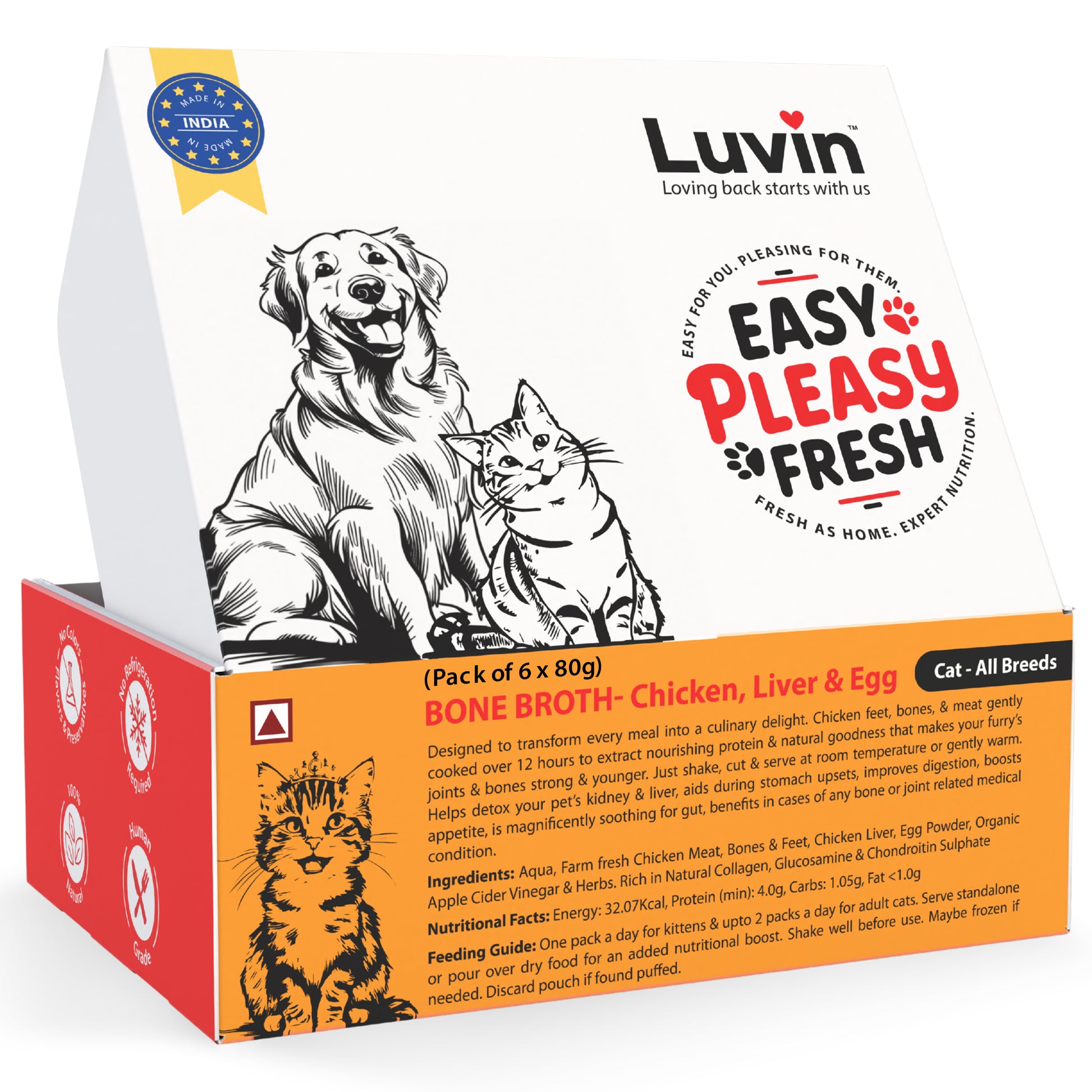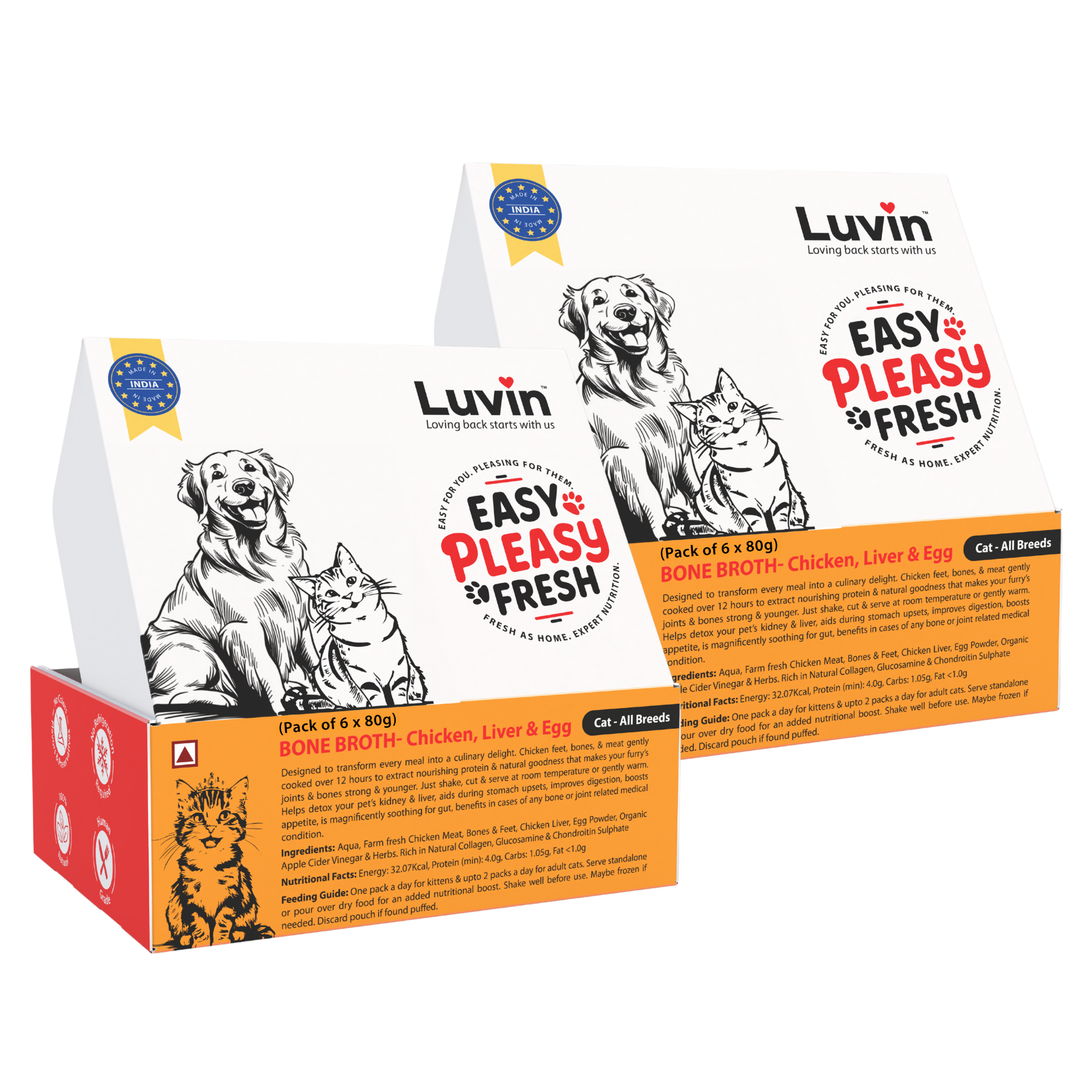 Our Chicken bone broth is prepared by gently cooking chicken feet, bones, ligaments & tendons over 12 hours to extract nourishing protein and natural goodness that makes your furry’s joints & bones strong and younger. It is naturally rich in Collagen, Glucosamine & Chondroitin; considered useful in cases of hip dysplasia and osteoarthritis